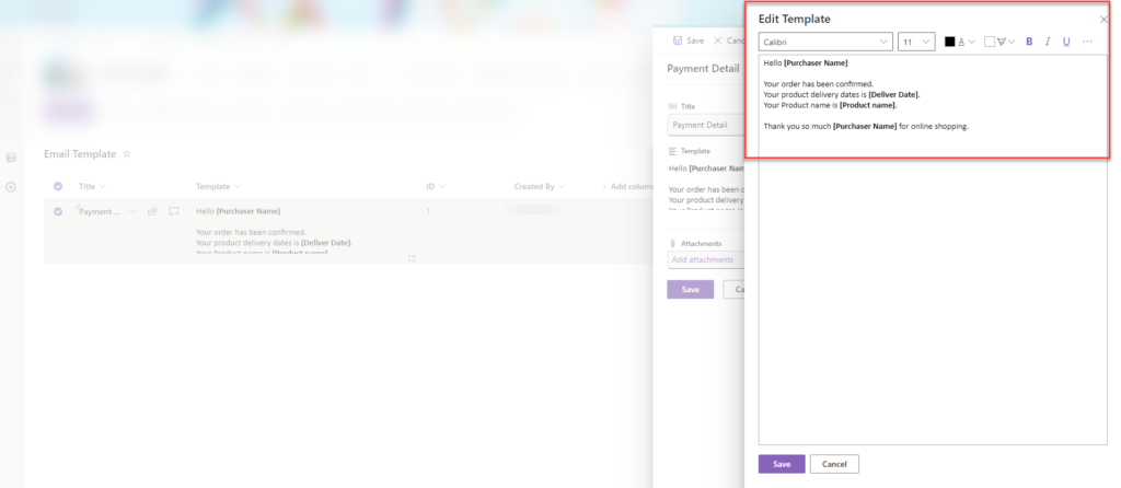 Additionally, we have created a template where we retrieve four values from another list: “Purchaser Name,” “Delivery Date,” “Product Name,” and “Purchaser Name.”