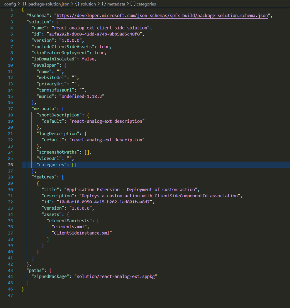 – id: Unique identifier for the solution package. – version: Version of the solution package. – includeClientSideAssets: Indicates whether to include client-side assets in the package. – skipFeatureDeployment: Indicates whether to skip feature deployment during package installation. – isDomainIsolated: Specifies whether the solution package is domain isolated. – developer: Information about the developer including name, website URL, privacy URL, terms of use URL, and MPN (Microsoft Partner Network) ID.