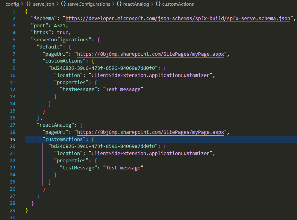 – default: Default serve configuration. – pageUrl: URL of the SharePoint page to load when serving the project. – customActions: Configuration for custom actions to be applied when serving the project. – location: Specifies the location of the custom action. – properties: Custom properties to be passed to the custom action. – reactAnalog: Serve configuration specific to a scenario named “reactAnalog”. Similar structure to the default configuration.