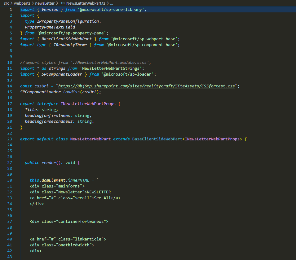 Purpose: –In React-based projects, this folder encapsulates the component-based structure, facilitating the creation and management of reusable UI elements. “webpart.tsx” serves as the main React component file, orchestrating the rendering and functionality of the web part.