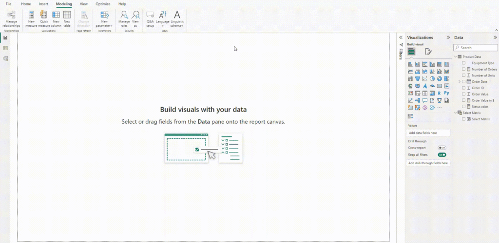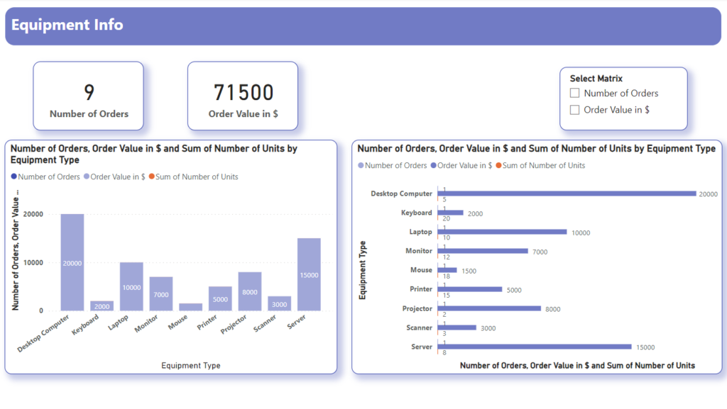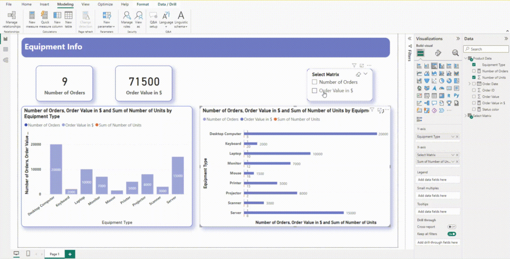 Ensure that your measures are clearly named and readily available in your dataset. Here, prepare a spreadsheet for “Equipment Data” to represent “Equipment Type,” “Number of Units,” and “Order Value.
