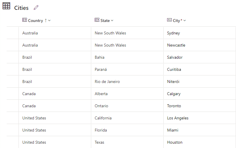 Next, create a City table. This table will have three columns: Country (lookup to the Country table), State (lookup to the State table), and City Name (a single line of text that contains the name of the city based on the selected state). Populate this table with cities associated with their respective states and countries (e.g., Los Angeles for California, Toronto for Ontario). Now, you have a structure in place where the relationships between Country, State, and City are ready for cascading functionality.