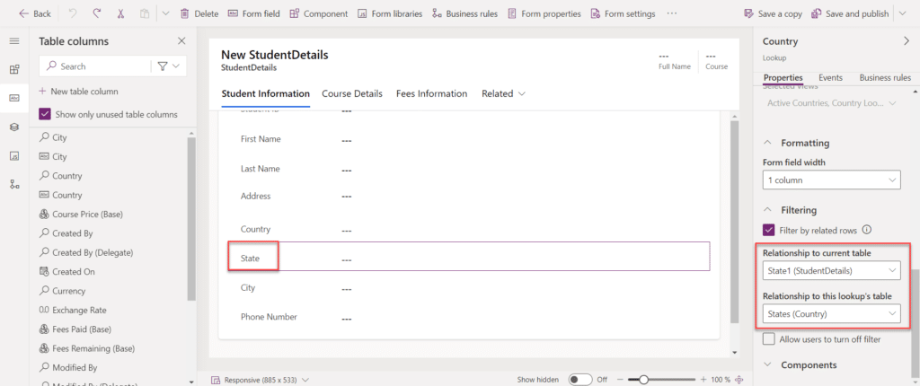 Once the relationships are set, go to the Main Form where users will input data. Select the State field, and in the properties pane on the right, configure the Filtering option. Set the State field to be filtered based on the selected Country and relationship. Repeat this process for the city field, ensuring that it filters based on the selected State. After configuring the filtering for the fields, save your changes and publish the app.