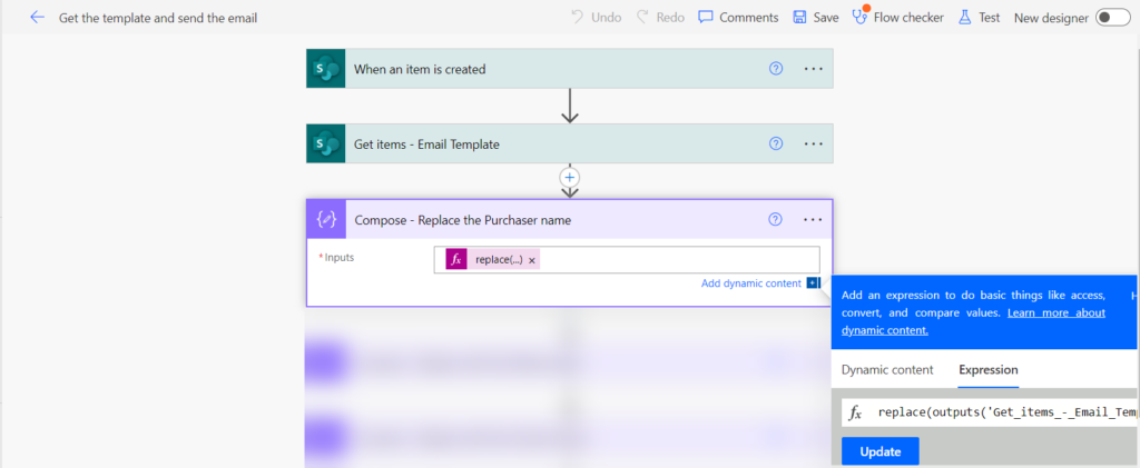 replace(outputs(‘Get_items_-_Email_Template‘)?[‘body/value’][0][‘Template’],'[Purchaser Name]’,triggerOutputs()?[‘body/Author/DisplayName’])