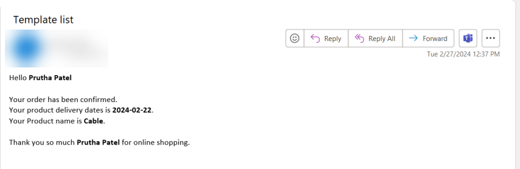 In the template, we replace “Purchaser Name” with the name of the creator, retrieved from the “Created By” column in the list. The “Delivery Date” is substituted with the dynamic value from the “Delivery Date” column in the “Online Order Product Details” list. Similarly, the “Product Name” column is replaced with the dynamic value from the “Product Name” field in the “Online Order Product Details” list.