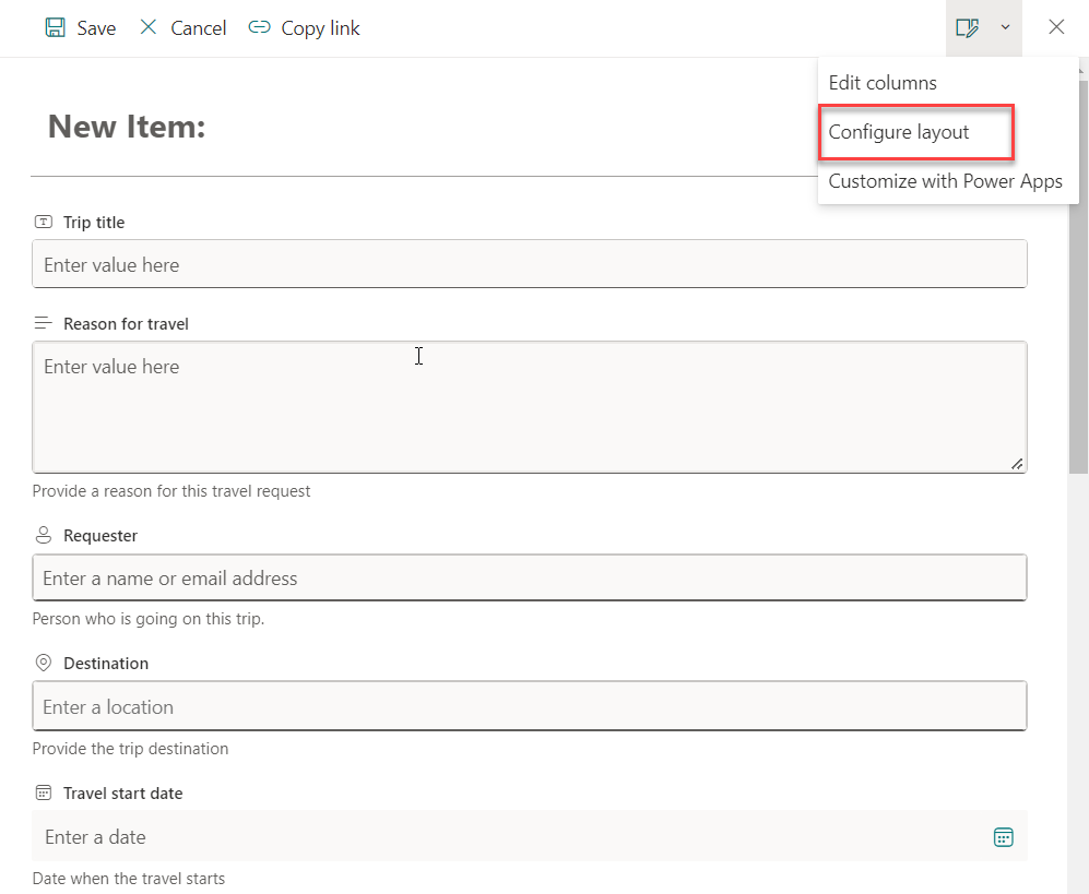 - Choose “Edit columns” from the options available in the top-right corner of the New form.