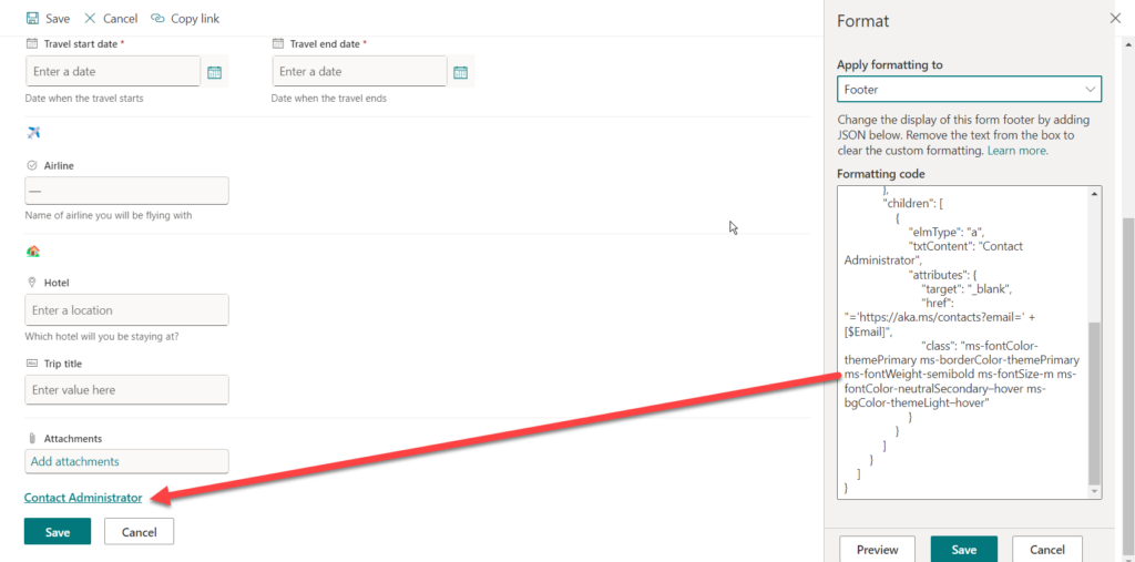 3. Customize the SharePoint Online List Form footer using JSON formatting. After choosing the “Configure layout” option, select the “Footer” option from the dropdown in the “Apply formatting to” section.