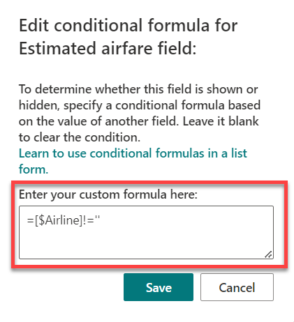 Following that, you will encounter the field where you can input your formula. As an example, here is the code for the “Estimated Airface” field: when a specific value is selected in the “Airline” column, the estimated airfare will be displayed; otherwise, it will be hidden.