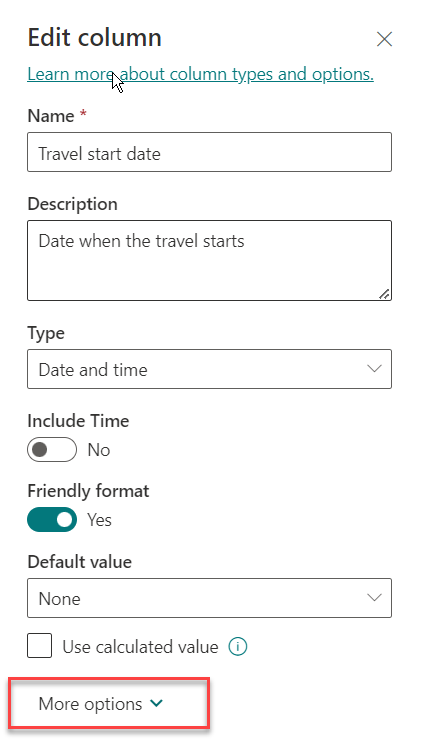 - –First, enter the Edit mode for that column and then click on “More options.” And click on “column validation”