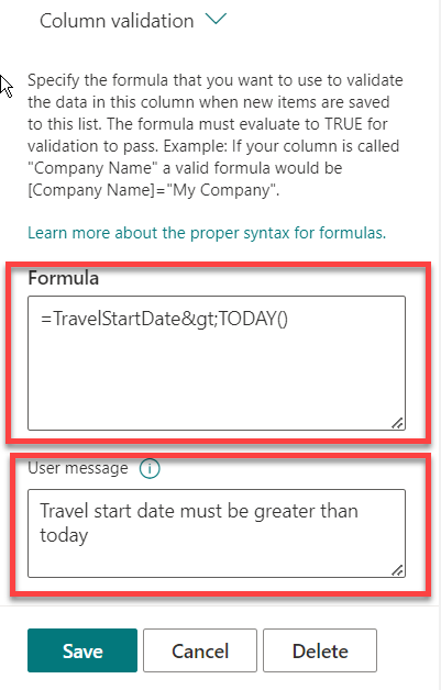 - In my SharePoint list, there is a column named “Travel Start Date,” and I aim to enforce a rule that this date must be greater than or equal to today’s date.: =TravelStartDate>TODAY().